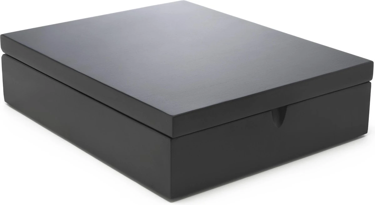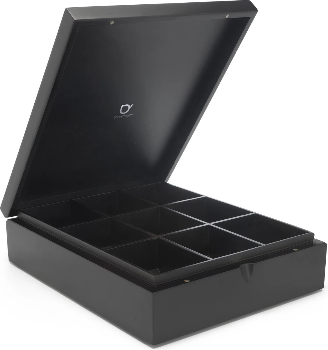 Berg al je favoriete theesmaakjes op in deze handige theedoos van Bredemeijer. De theedoos heeft 9 vakjes en is gemaakt van mooi en duurzaam bamboe. Dit materiaal en de kleur zwart geven het geheel een chic uiterlijk. De theedoos is voorzien van een gesloten deksel.