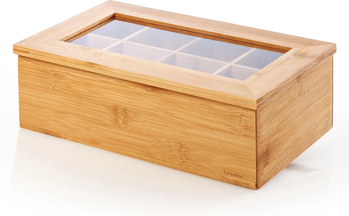 De stijlvolle en decoratieve bamboe theedoos uit de Lumaland Cuisine is uitgerust met 8 vakken en geschikt voor alle gangbare theezakjes. Door het transparante venster is direct zichtbaar hoe vol de theebox is en of deze eventueel bijgevuld moet worden.