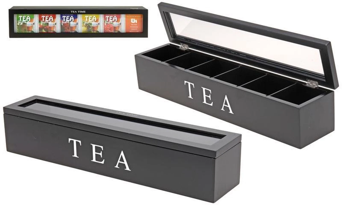 De theebox heeft een mooie elegante uitstraling. Met 6 vakken kun je altijd je favoriete theezakjes opbergen. De prachtige opgelegde letters maken de uitstraling compleet. De theekist is gemaakt van hout en heeft een glazen deksel.