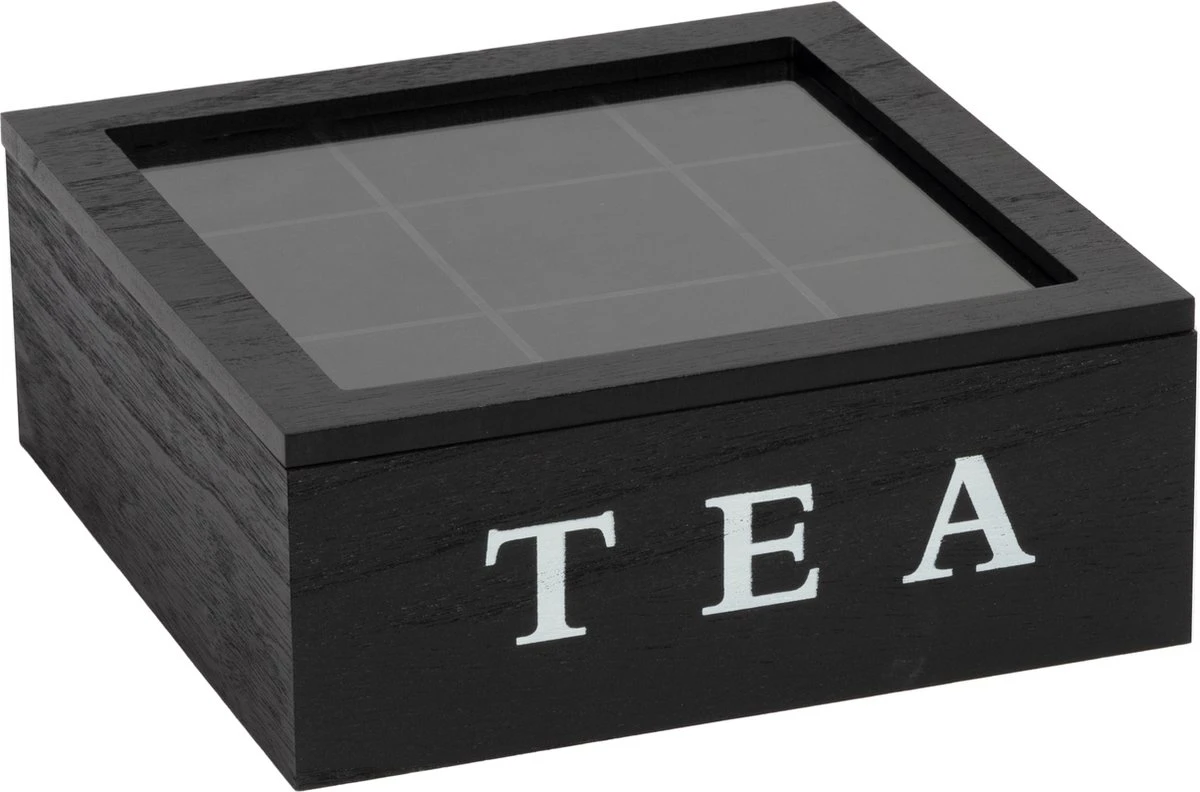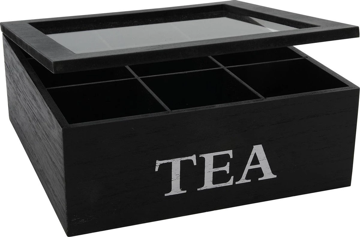 Theekist – Zwart – Hout 9-Vaks – Glazen Deksel – Theedoos