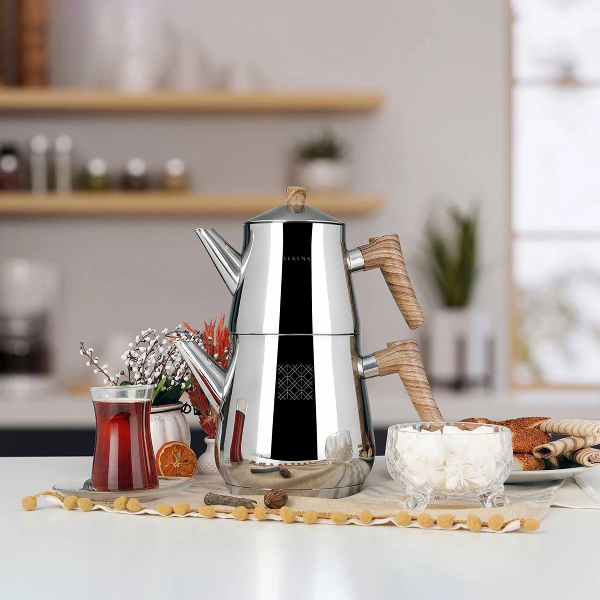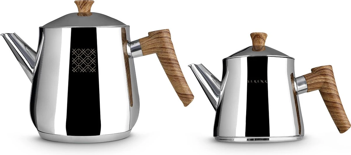 SERENK TURKISH THEAPOT: Serenk theepot en theeketelset is gemaakt van een stevige 18/10 roestvrijstalen constructie die buitengewoon goed bestand is tegen krassen, vlekken en zijn schoonheid en prestaties een leven lang zal behouden. Elegant gepolijst exterieurdesign ziet er opvallend uit op elke kookplaat