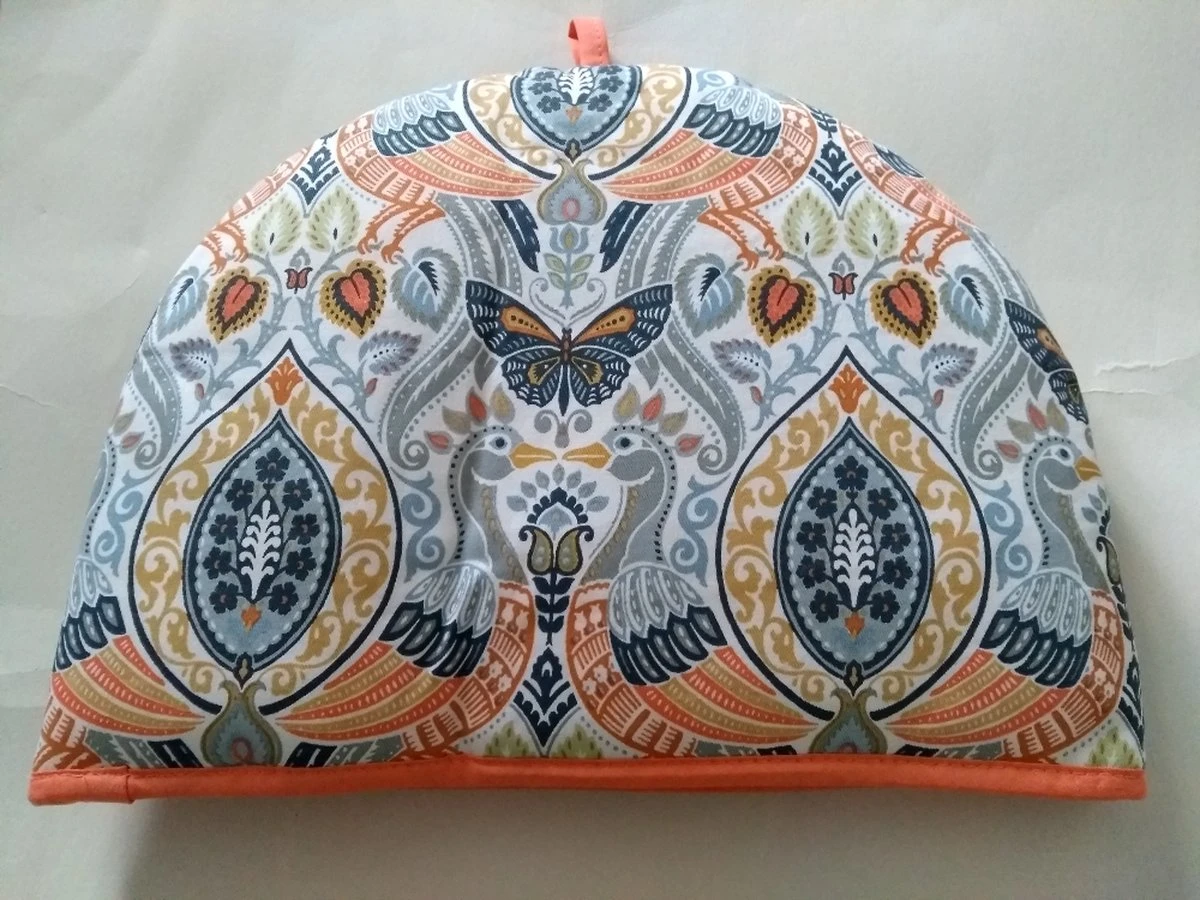 Goed isolerende theemuts van het merk Ulster Weavers. Deze katoenen theemuts heeft een polyester vulling en is wasbaar op 40º. Geschikt voor een normale tot grote maat theepot. Het dessin bestaat uit gestyleerde bladeren en dieren op een witte achtergrond. De binnenvoering is effen oranje.